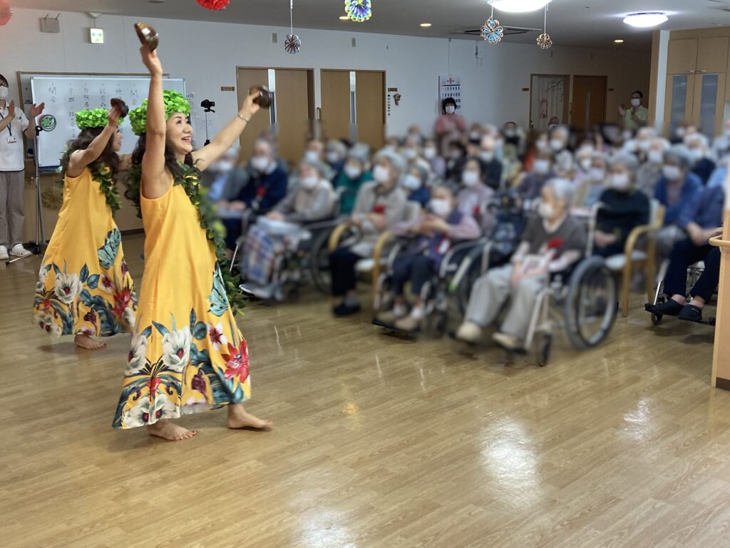 余興では「結の会」様に、慰問にいらしていただき、歌や踊りを披露していただきました。最後は 職員や入居者様も踊りに参加し、会場は大いに盛り上がりました。