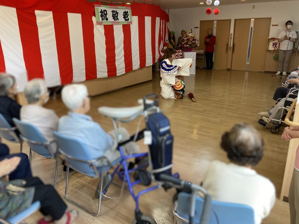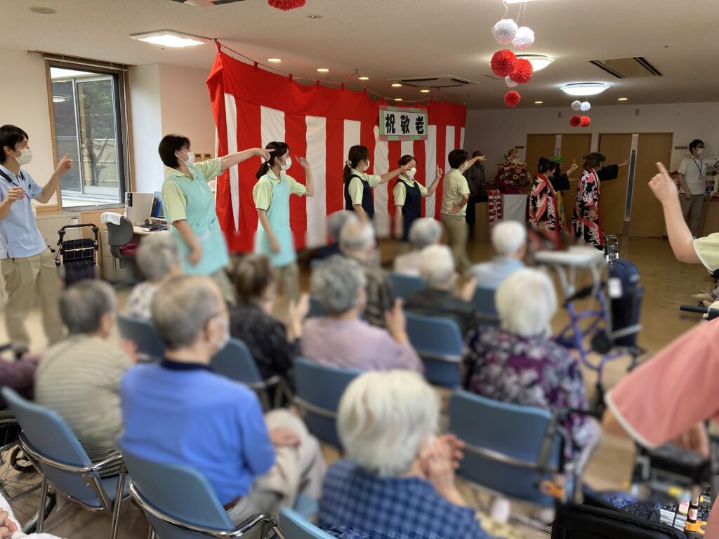 令和7年9月17日(水)に敬老会を開催いたしました。コロナ渦で2019年以来の開催となりましたが、入居者様に一同にお集まりいただき、盛大に行うことができました。