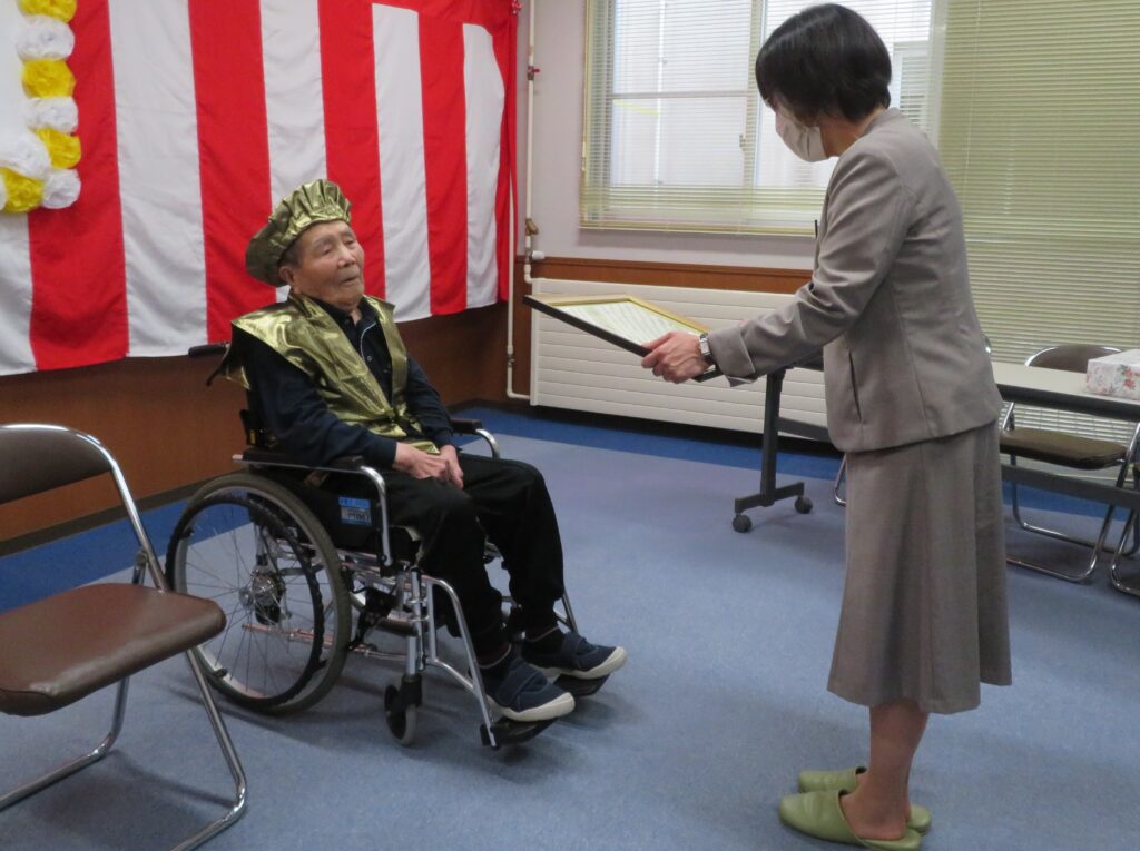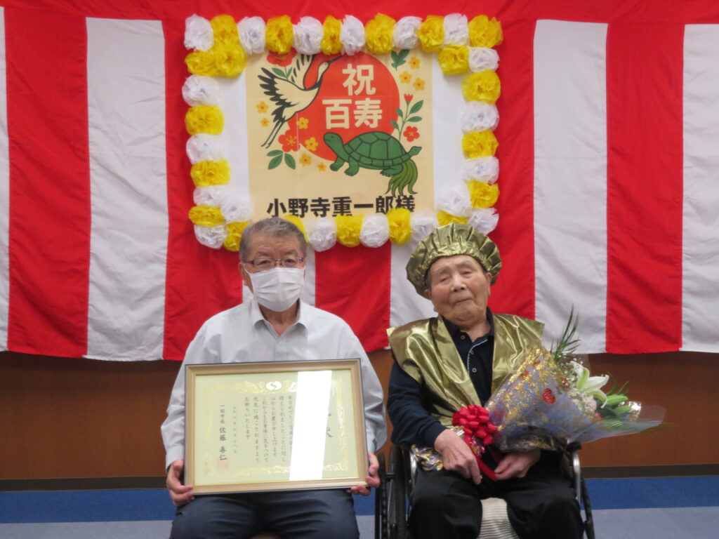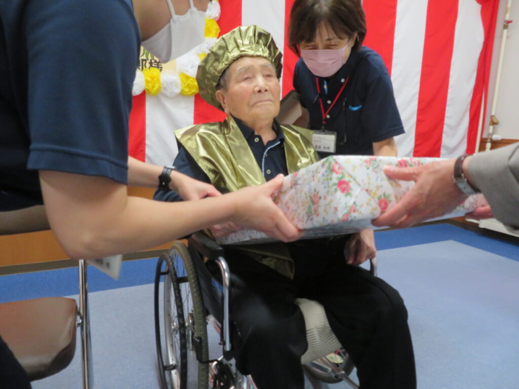 令和7年9月18日(木)入所者様が100歳の誕生日を迎えるにあたり、一関市からの記念品贈呈式をやまゆり施設内で行ないました。