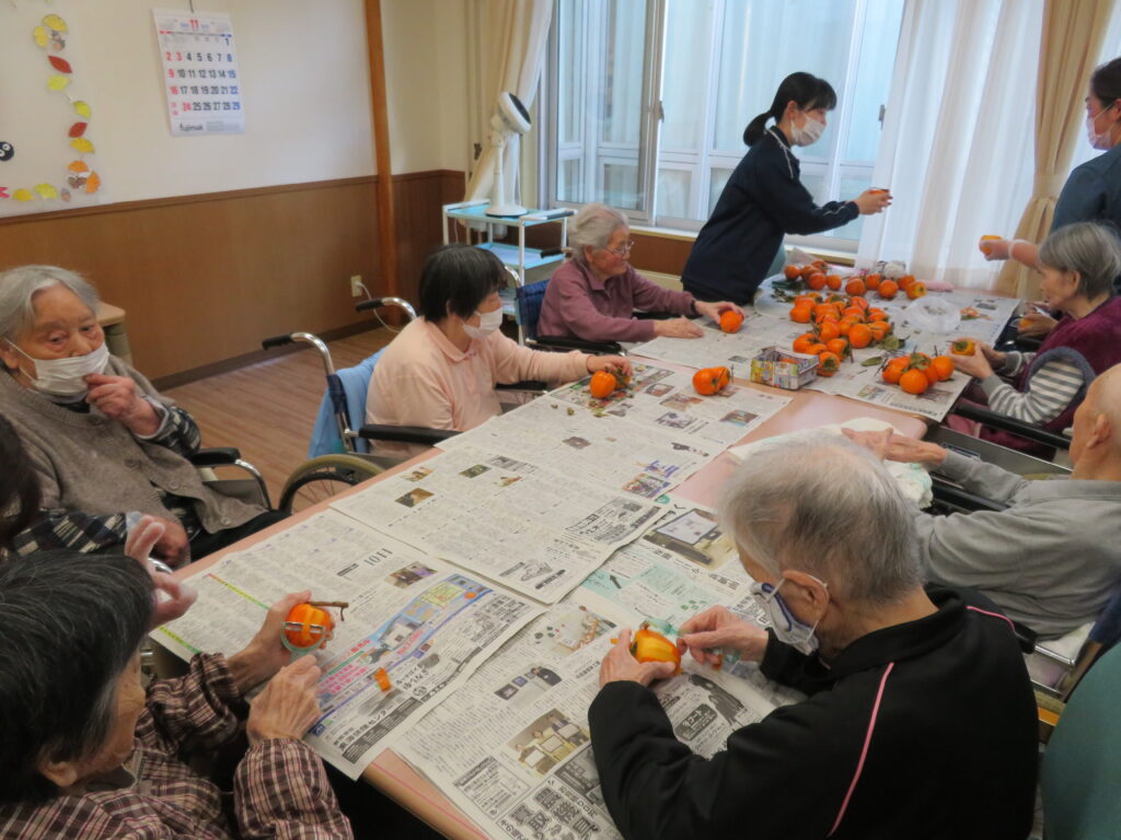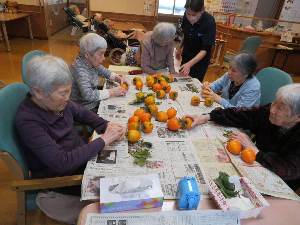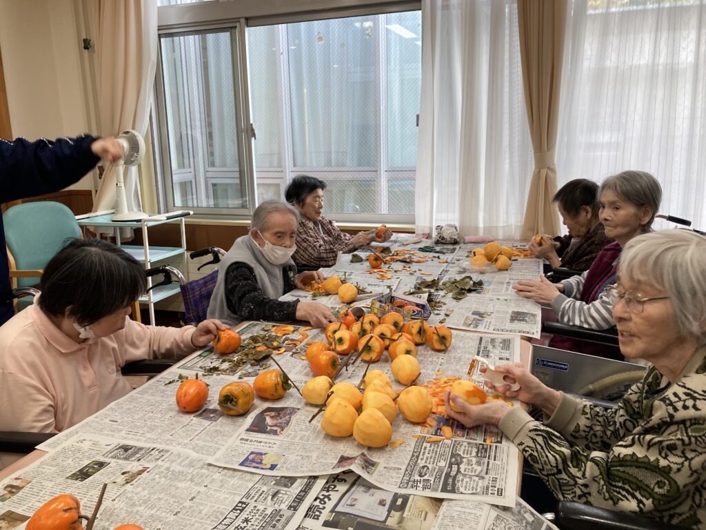 11月上旬、ご利用者の皆様と一緒におやつレクリエーション「干し柿作り」を実施しました。