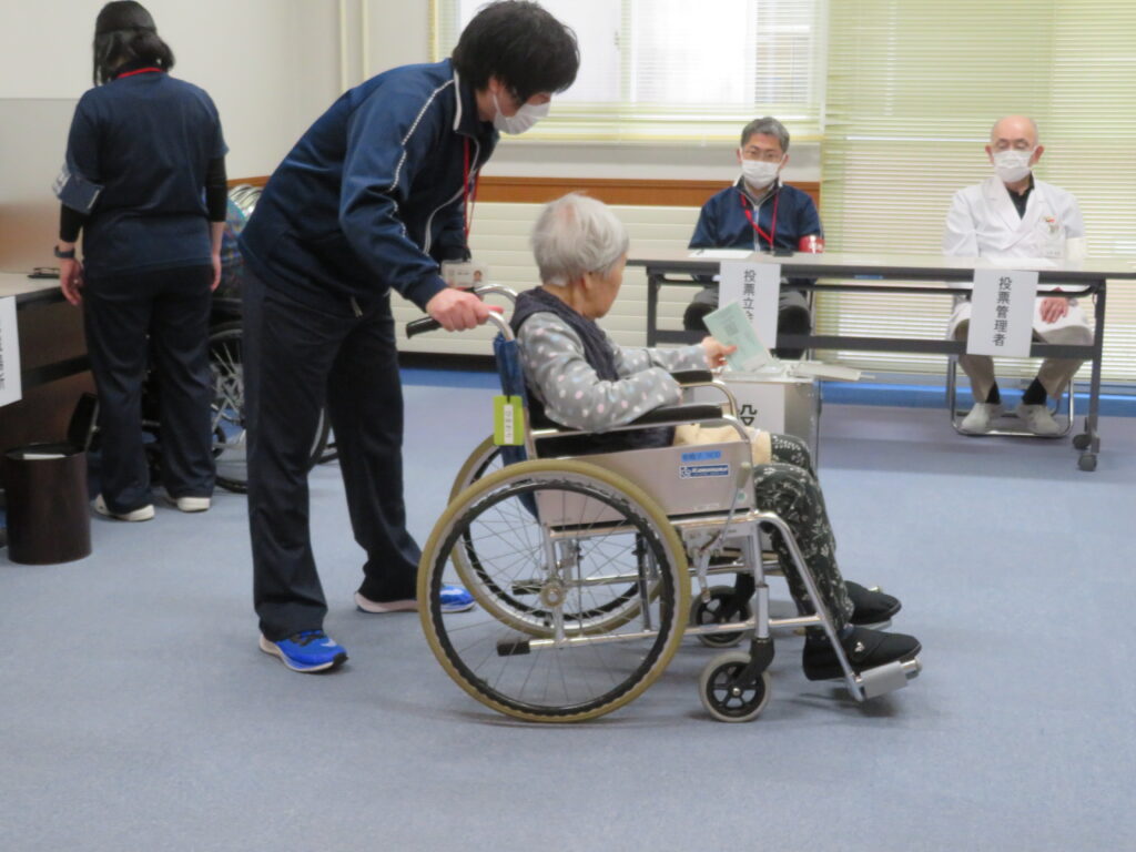 いつもは穏やかに過ごされている皆様も、この日は少し緊張した面持ちで、候補者名や政党名を一字ずつ丁寧に記入されていました。ご自身の手で投票箱へ用紙を入れる姿はとても凛々しく、「施設にいても自分の意思で投票ができてよかった」と喜ばれるお声も多く聞かれました。入所者様お一人おひとりの大切な一票を投じる、こうした「社会とつながる機会」を、私たちはこれからも大切にサポートしてまいります。