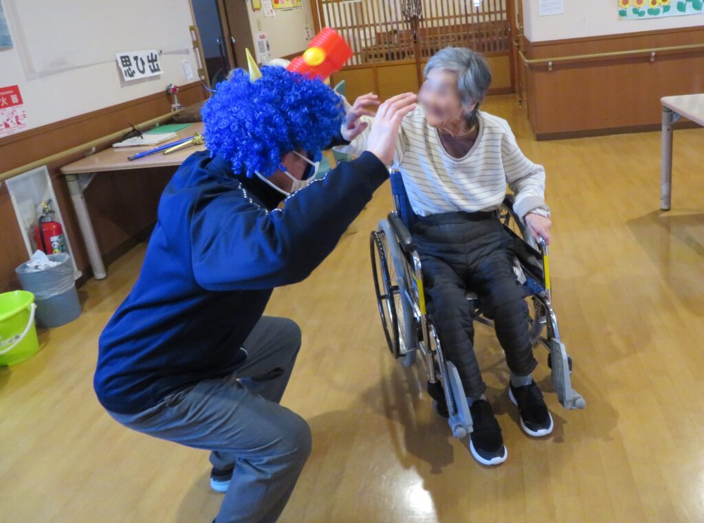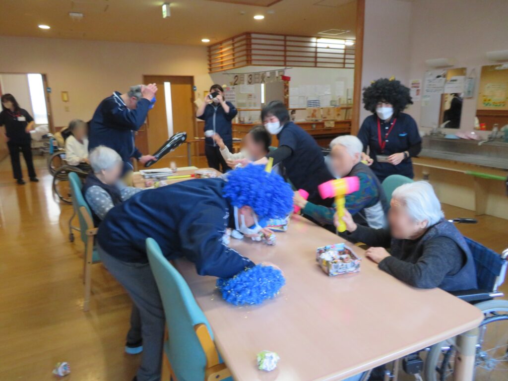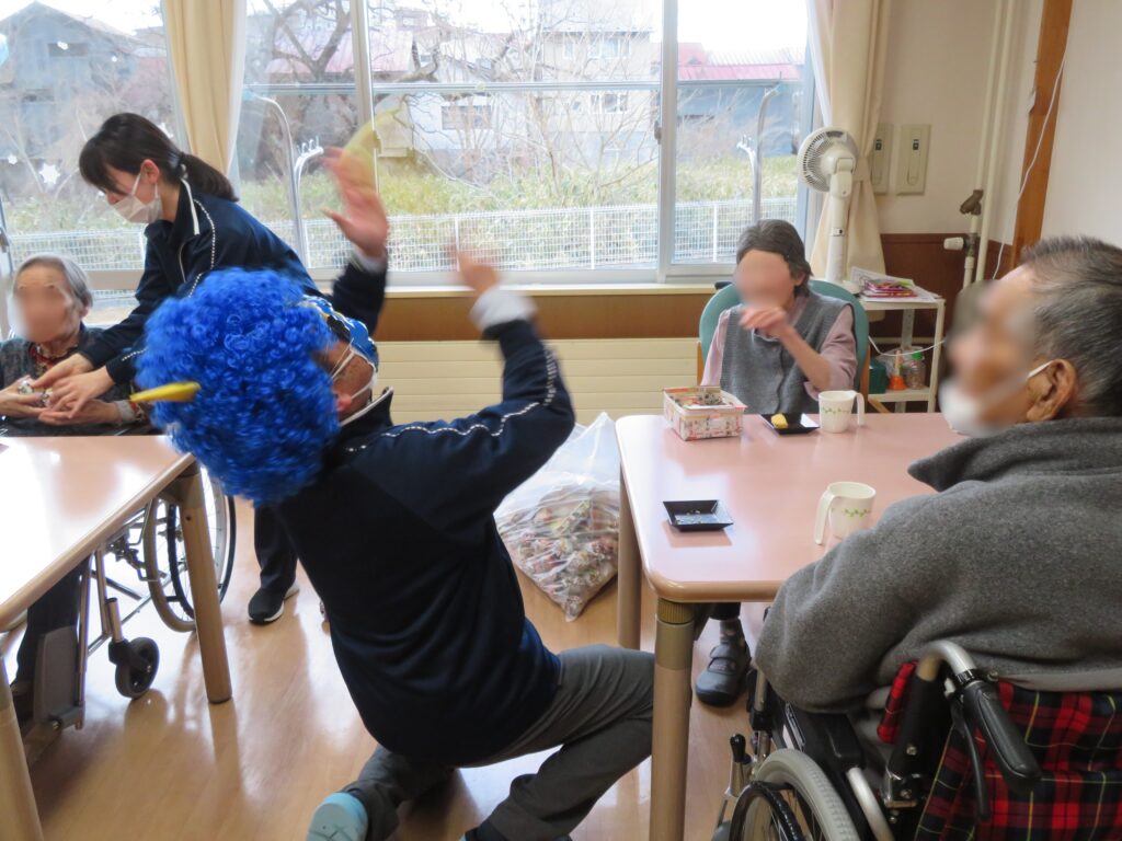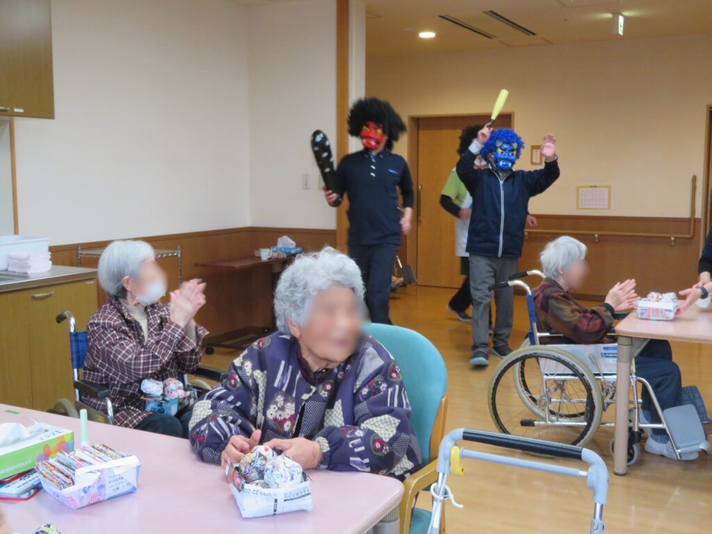 施設内を回りながら、「リハビリ頑張ってるかな?」「ご飯はしっかり食べてる?」と声をかけると、怖いはずの『鬼』から優しい言葉をかけられた入所者様は、驚きながらも笑顔で応えてくださいました。一生懸命作られたボールで力いっぱいの「厄払い」をしていただき、見事に鬼も降参して退散!